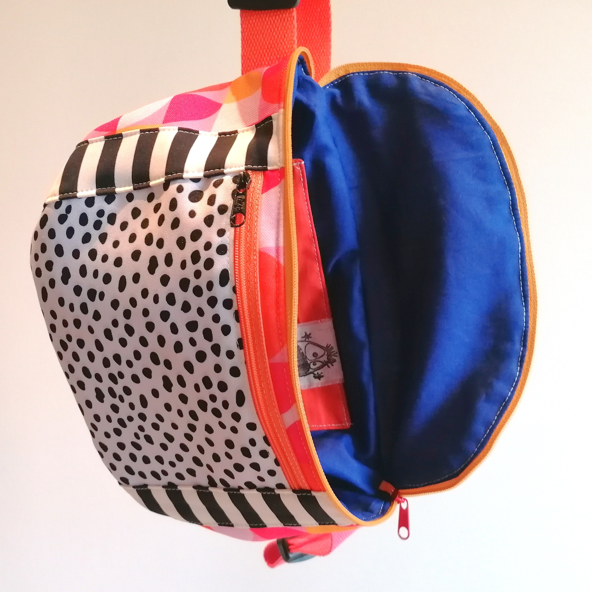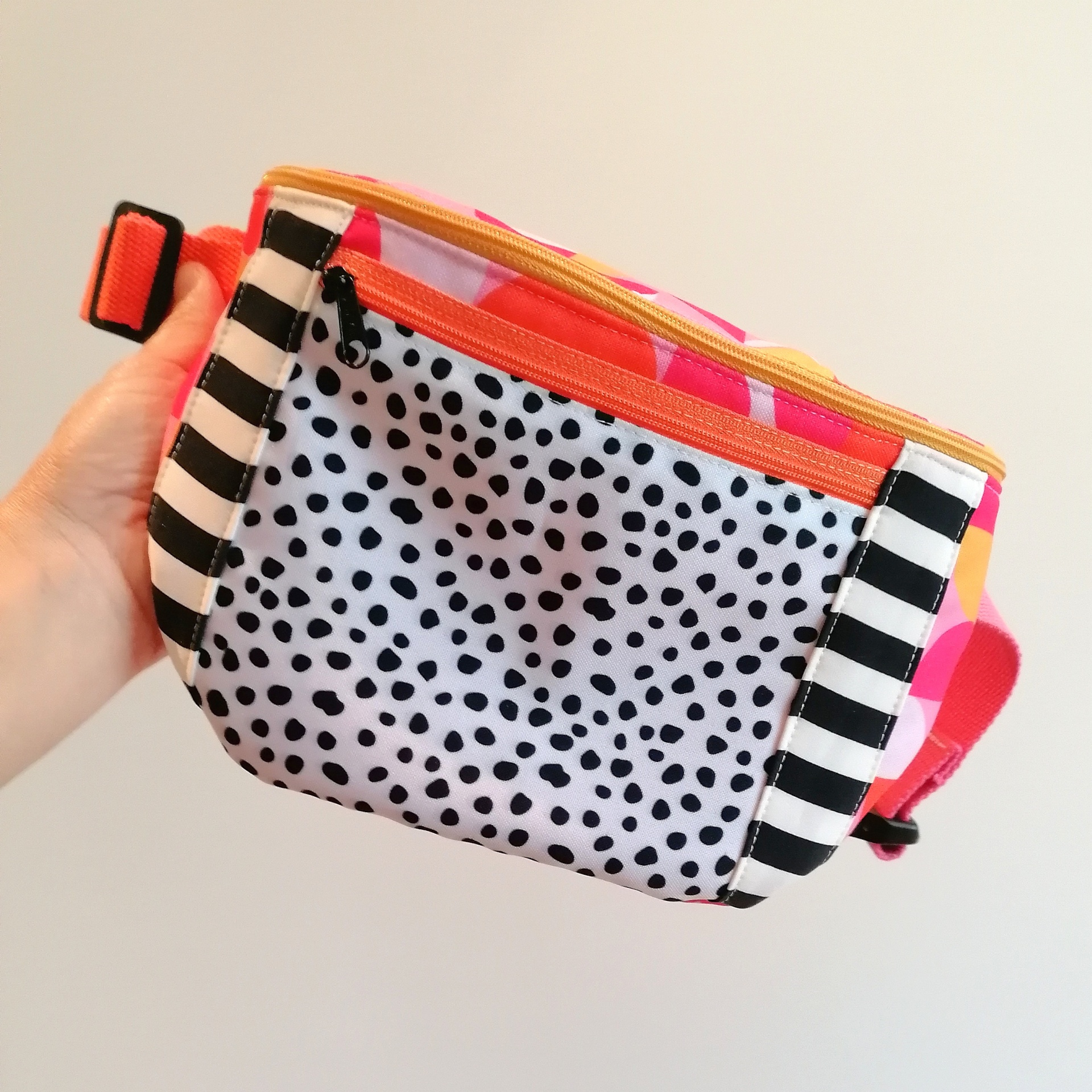 Tem 1 bolso na parte de fora, à frente, e um bolso no interior. A alça é regulável, para poderes usar a bolsa à cintura ou a tiracolo.