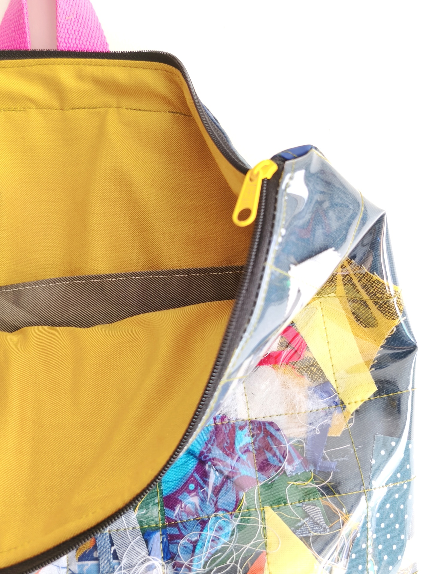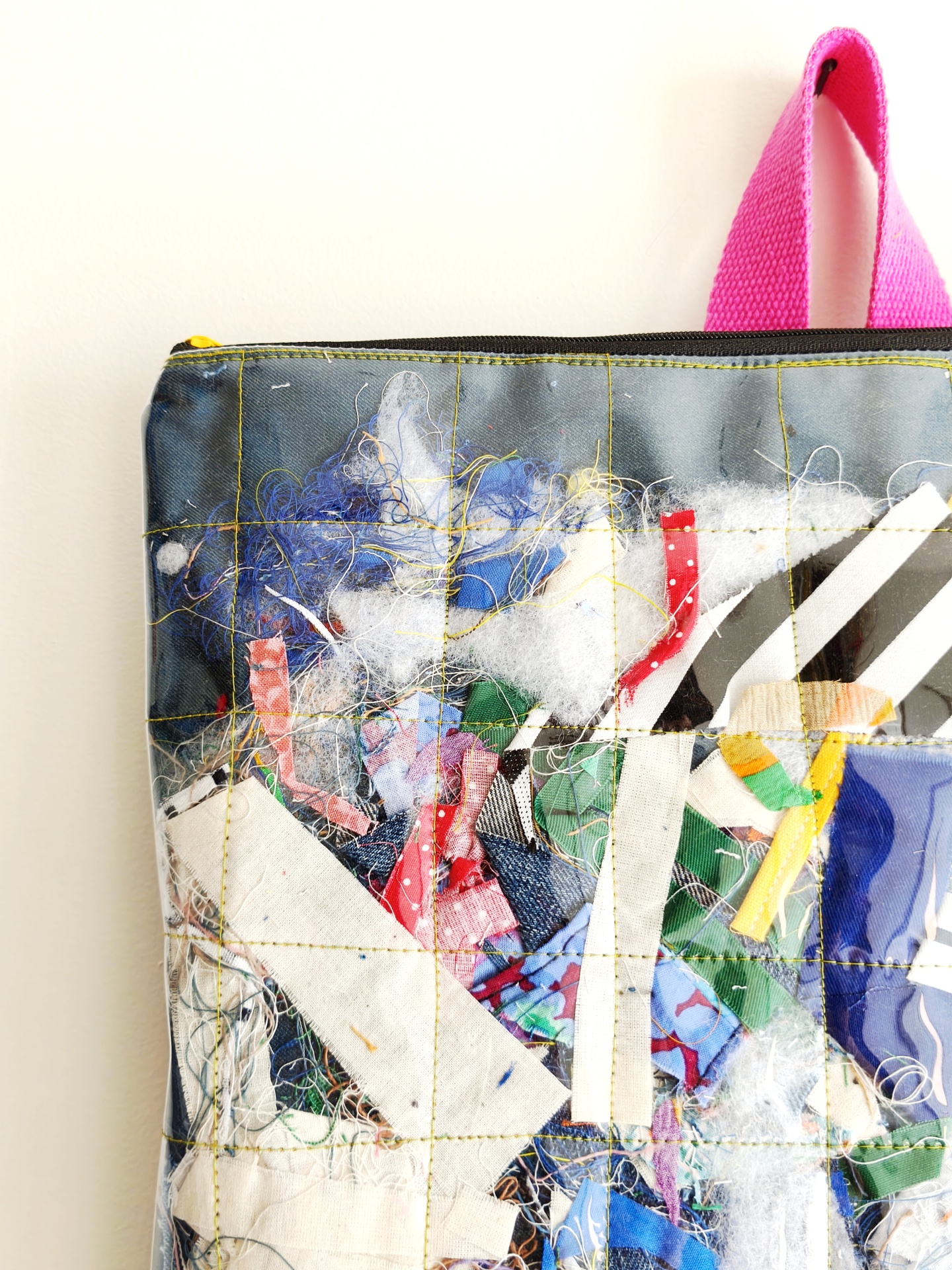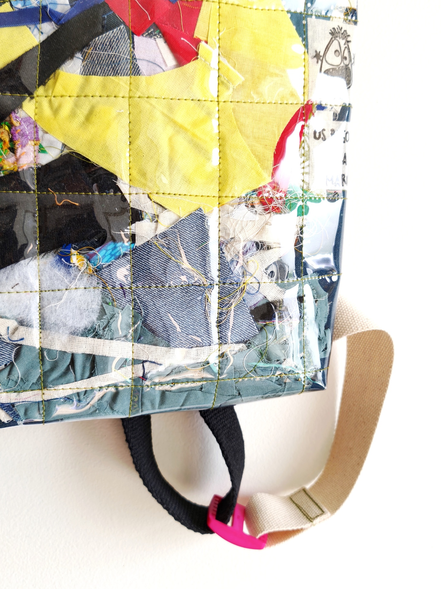 Estas mochilas são únicas, irrepetíveis e impermeáveis! Feitas com ganga e desperdícios têxteis, segura por cristal transparente, não há duas iguais!