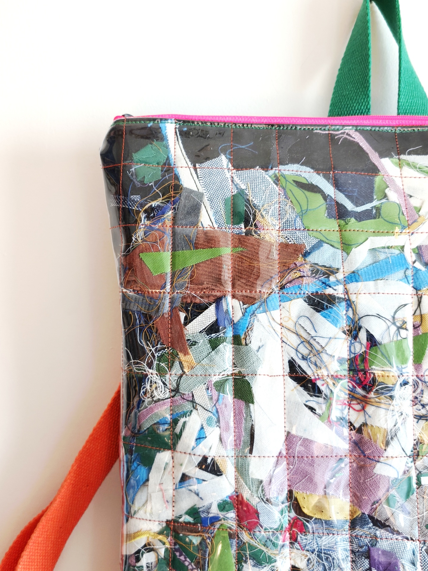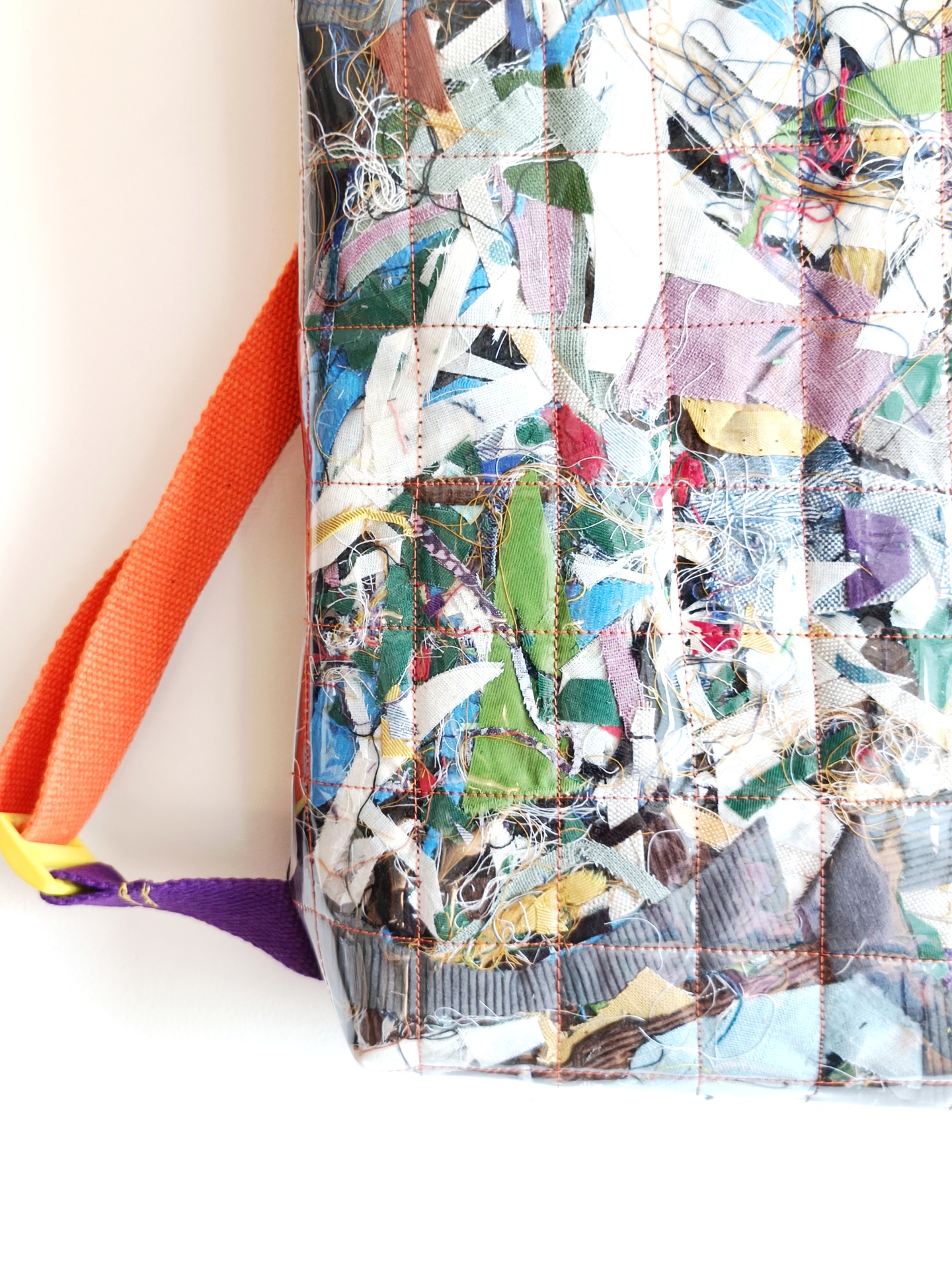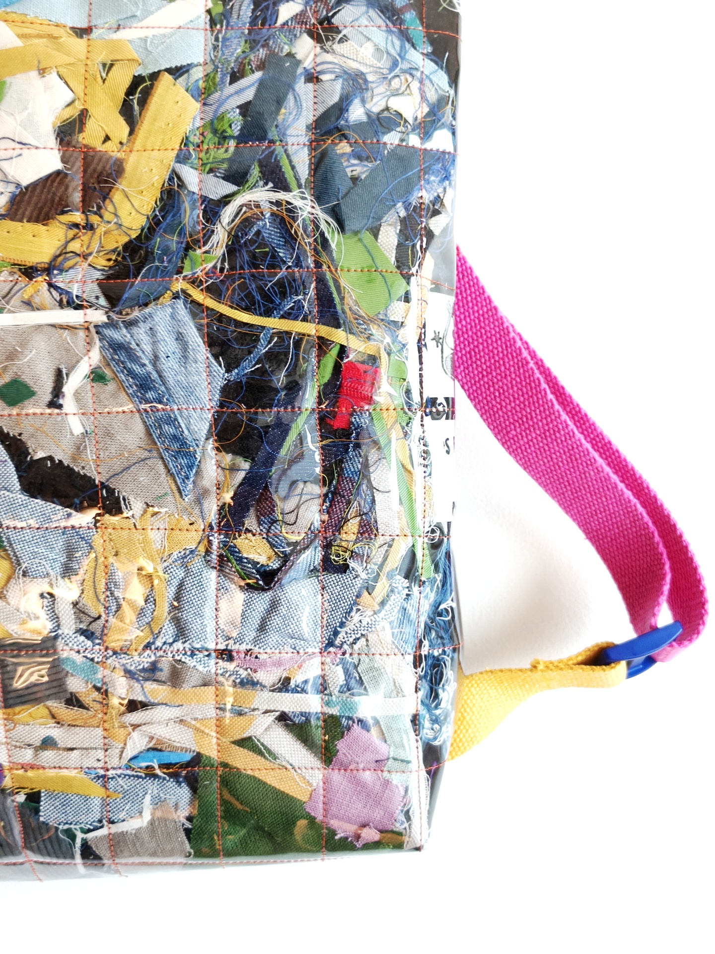 Estas mochilas são únicas, irrepetíveis e impermeáveis! Feitas com ganga e desperdícios têxteis, segura por cristal transparente, não há duas iguais!